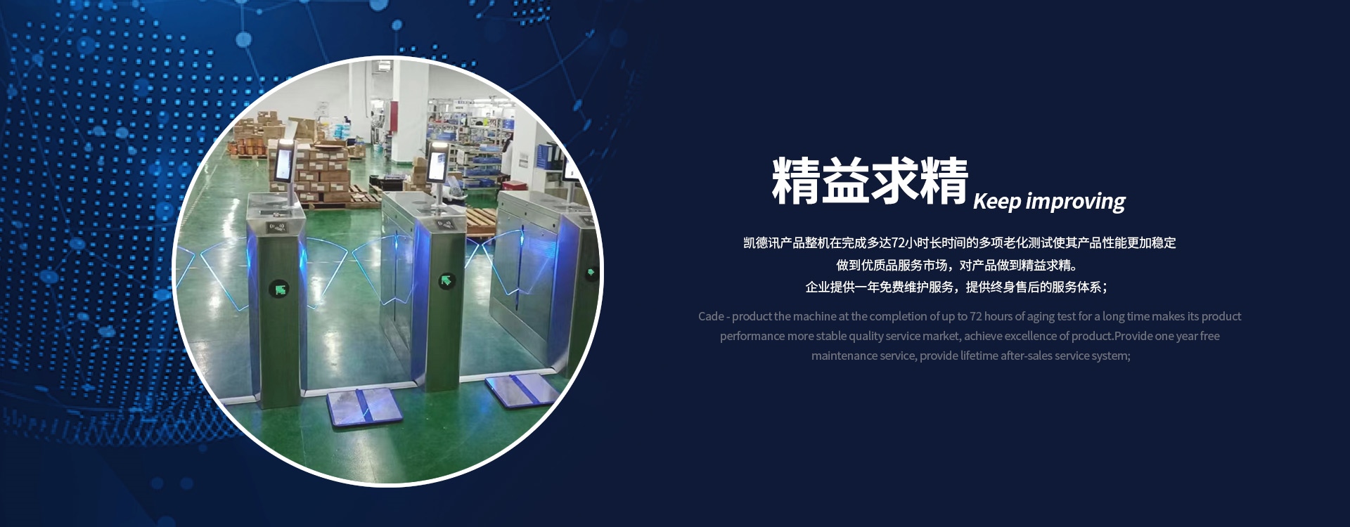 深圳市凱德訊科技有限公司成立于2003年,注冊資本500萬元,位于港珠澳大灣區(qū)的深圳市,公司集研發(fā)、生產(chǎn)、銷售電子行業(yè)防靜電門禁系統(tǒng)和民用智能通道系統(tǒng)的綜合性企業(yè)。公司擁有自主產(chǎn)權(quán)的產(chǎn)品并一直致力于ESD門禁系統(tǒng)、智能安防門禁系統(tǒng)、景區(qū)通道閘機(jī)、人臉識別閘機(jī)、消費系統(tǒng)、智能翼閘的研發(fā)生產(chǎn)與銷售。凱德訊目前擁有多款功能齊全的系統(tǒng)軟件及多款硬件產(chǎn)品,包含成型加工、機(jī)芯研發(fā)、軟件開發(fā)等技術(shù)均為本公司自主研發(fā)、獨立完成。14年來,凱德訊一直秉承以用戶需求為核心,穩(wěn)定、實用、智能的產(chǎn)品是我們開拓市場的基石,務(wù)實進(jìn)取的精神是我們孜孜不倦的追求,全方位真誠的服務(wù)是我們對您永恒的承諾。
